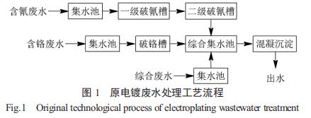 江蘇某電鍍企業(yè)主要進行鍍金、鍍銀、鍍鎳、鍍銅、鉻白和涂裝等加工,日平均廢水總量約為 300t/d。電鍍廢水主要是含氰、含鉻以及酸堿綜合廢水,分別對這三股進行預(yù)處理后,進入調(diào)節(jié)池進行混勻,混凝沉淀后排放,工藝流程如圖 1 所示。